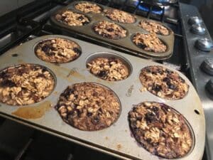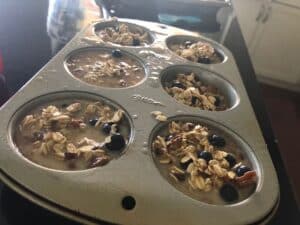 You will notice that the “batter” for this recipe is quite runny! Don’t worry! The oats will drink up the liquid, resulting in a breakfast “muffin” or cup. If you don’t have fresh blueberries, enjoy with frozen blueberries with a sprinkle of flour overtop to prevent the blueberries from “bleeding” into the oatmeal cup!