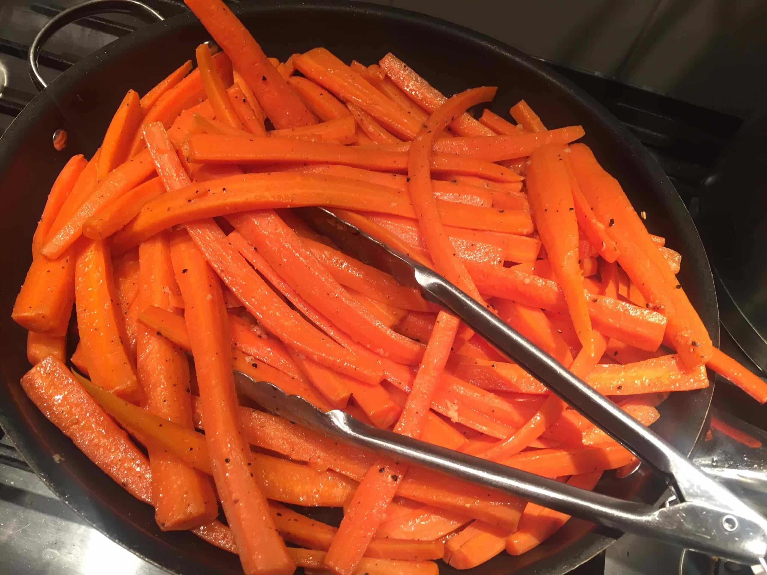 - Heat a large frying pan over medium-high heat. Add in olive oil, garlic and carrots. Sauté for another 2 minutes. Add in salt and pepper to taste.